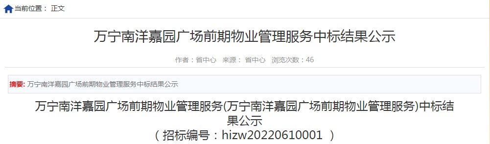 万宁南洋嘉园广场前期物业管理服务中标结果公